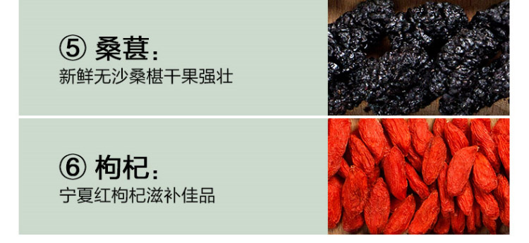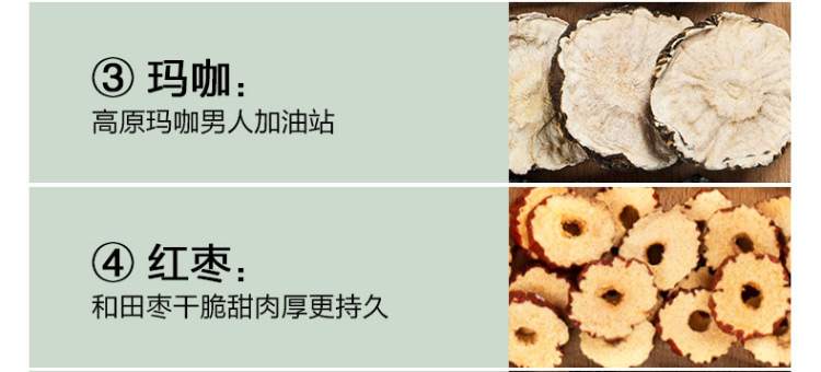 • 主要成分枸杞,黃精,桑葚,紅棗,人參,瑪咖